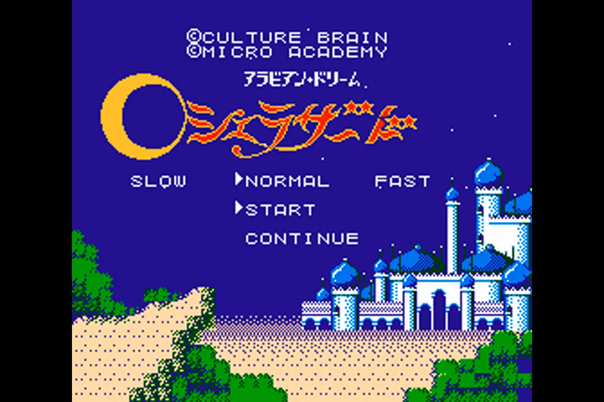 『アラビアンドリーム シェラザード』は、アクションRPGとして1987年に発売された作品です。アラビア風の世界観とタイムトラベル要素を取り入れた五つのワールドを舞台に、主人公が仲間や姫を救出しながら冒険を繰り広げます。ゲームは固定画面のアクションモードと、特定条件で突入するRPG風の「魔法合戦」モードで構成され、アクションとコマンドバトルが融合した独特のゲーム性が特徴です。